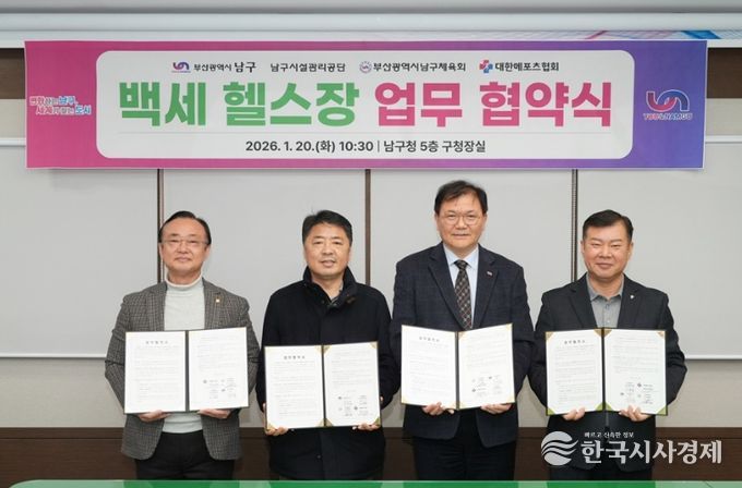 한국시사경제 의료보건팀 | 부산 남구와 부산 남구시설관리공단(이사장 이무진), 부산 남구체육회(회장 정춘식), 대한메포츠협회(협회장 나용승)는 지난 20일, 남구청에서 어르신 전용 백세 헬스장 전문 운영을 위한 업무협약(MOU)을 체결했다고 밝혔다.
