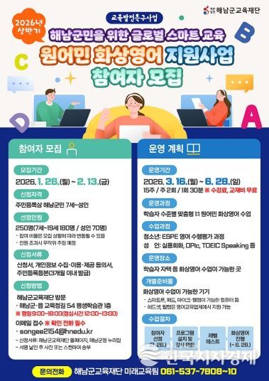 한국시사경제 권충현 기자 | 재단법인 해남군교육재단(이사장 명현관)은 상반기 원어민 화상영어 지원사업의 참여자를 모집한다. 지난 2023년부터 시작된 원어민 화상영어 지원사업은 군민 누구나 양질의 영어 교육을 받을 수 있도록 해 지역 내 교육 불균형을 해소하고, 미래 글로벌 인재 양성에 기여하기 위해 운영되고 있다.