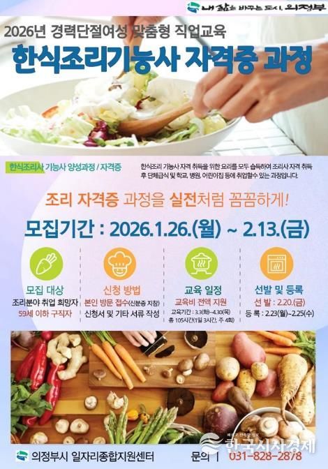 한국시사경제 경기북부취재본부 | 의정부시는 경력단절여성의 안정적인 재취업을 지원하기 위해 ‘2026년 한식조리기능사 자격증 과정’ 참여자를 모집한다.