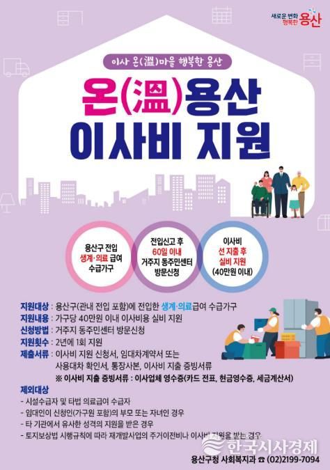 지원 대상은 용산구로 전입(관내 전입 포함)한 국민기초생활보장 생계·의료급여 수급가구로, 이사비를 선지출한 뒤 신청하면 가구당 최대 40만 원 범위 내에서 실제 소요된 이사비용을 지원받을 수 있다.