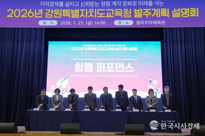 한국시사경제 문화팀 | 강원특별자치도교육청은 23일 원주 치악체육관에서 청렴한 계약문화 확산과 지역경제 상생을 위한 ‘2026년 공사·용역·물품 발주계획 설명회’를 개최했다.