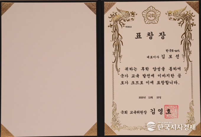 한국시사경제 김숙영 기자 | K-art 김보선 작가, 2025년 12월 23일 한국프레스센터에서 한국시사경제 • 코리아타임뉴스(윤광희 회장)주최, SBS • 기획재정부 • 교육부 • 문화체육관광부 • 농림축산식품부 • 산업통상부 • 기후에너지환경부 • 고용노동부 • 해양수산부 • 중소벤처기업부 후원으로 열린 ‘2025 대한민국 글로벌파워브랜드 대상(GPBA) 및 국회 상임위원장 표창 시상식’ 에서 김보선 작가가 대상과 국회 교육위원장 표창을 수상했다.