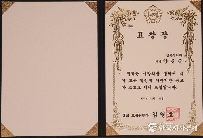 한국시사경제 이정이 기자 | 상록갤러리 양문숙 관장 2025년 12월 23일 한국프레스센터에서 한국시사경제 • 코리아타임뉴스(윤광희 회장)주최, SBS • 기획재정부 • 교육부 • 문화체육관광부 • 농림축산식품부 • 산업통상부 • 기후에너지환경부 • 고용노동부 • 해양수산부 • 중소벤처기업부 후원으로 열린 ‘2025 대한민국 글로벌파워브랜드 대상(GPBA) 및 국회 상임위원장 표창 시상식’ 에서 양문숙 작가가 대상과 국회 교육위원장 표창을 수상했다.