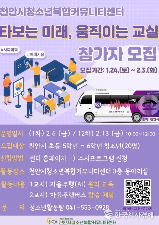 한국시사경제 충남취재본부 | (재)천안시청소년재단 천안시청소년복합커뮤니티센터가 겨울방학을 맞아 자율주행버스를 직접 타보고 미래 기술을 배우는 ‘타보는 미래, 움직이는 교실’ 참가자를 모집한다고 26일 밝혔다.