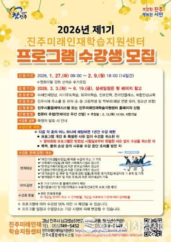 한국시사경제 윤광희 기자 | 진주시는 4차 산업혁명 시대를 선도할 미래인재를 양성하기 위해 진주시에 거주하는 유아와 초·중·고교생, 학부모를 대상으로 ‘2026년 제1기 진주미래인재학습지원센터 프로그램’ 수강생을 모집한다고 밝혔다.