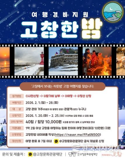 한국시사경제 전북취재본부 | 고창문화관광재단이 외부 관광객 유치와 지역 경제 활성화를 위해 여행경비지원 사업 ‘고창한밤’을 2026년에도 지속 추진한다고 밝혔다.