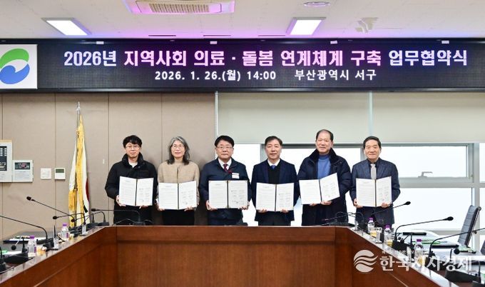 한국시사경제 의료보건팀 | 부산 서구는 지난 26일 ‘돌봄통합지원법’ 시행에 맞춰, 의료·요양·돌봄 통합지원기반을 조성하고자 ∆동아대학교대신병원(병원장 김기림), ∆바른병원(병원장 강정한), ∆선하요양병원(이사장 허방), ∆송도요양병원(이사장 정하용), ∆이의용밝은길요양병원(병원장 이의용)과 업무협약(MOU)을 체결했다.