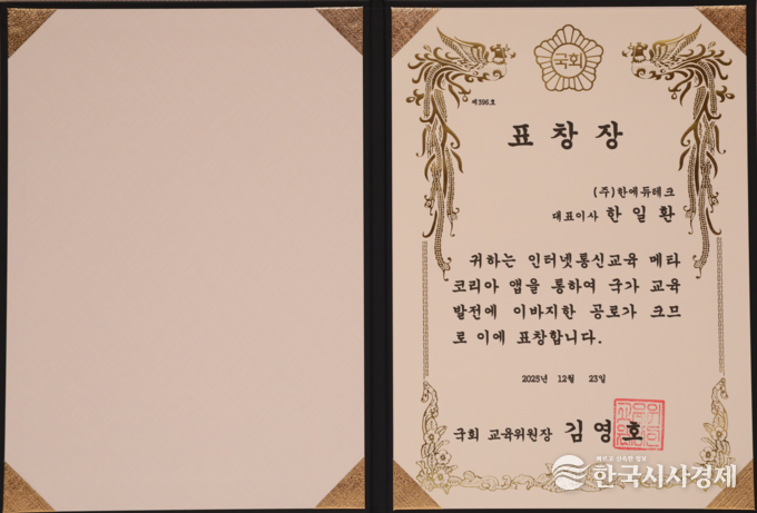 한국시사경제 이정이 기자 | 한에듀테크 한일환 대표, 2025년 12월 23일 한국프레스센터에서 한국시사경제 • 코리아타임뉴스(윤광희 회장)주최, SBS • 기획재정부 • 교육부 • 문화체육관광부 • 농림축산식품부 • 산업통상부 • 기후에너지환경부 • 고용노동부 • 해양수산부 • 중소벤처기업부 후원으로 열린 ‘2025 대한민국 글로벌파워브랜드 대상(GPBA) 및 국회 상임위원장 표창 시상식’ 에서 한일환 대표가 대상과 국회 교육위원장 표창을 수상했다.