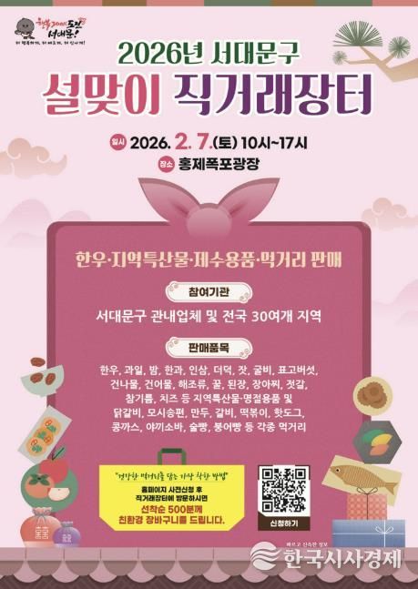 한국시사경제 노승선 기자 | 서대문구가 설 명절을 앞두고 시민에게 안전하고 품질 좋은 명절 먹거리를 합리적 가격에 제공하기 위해 2월 7일 오전 10시부터 오후 5시까지 홍제폭포광장에서 ‘2026년 설맞이 직거래장터’를 개최한다.
