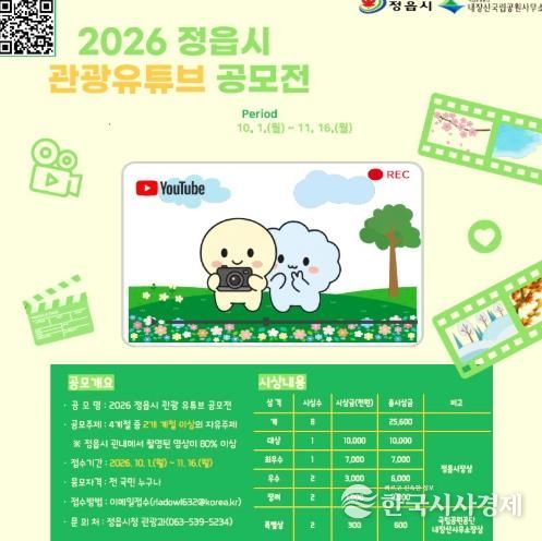 한국시사경제 전북취재본부 | 정읍의 관광자원과 일상적 매력을 전국에 알리기 위해 정읍시가‘2026 정읍시 관광 유튜브 공모전’을 개최한다.