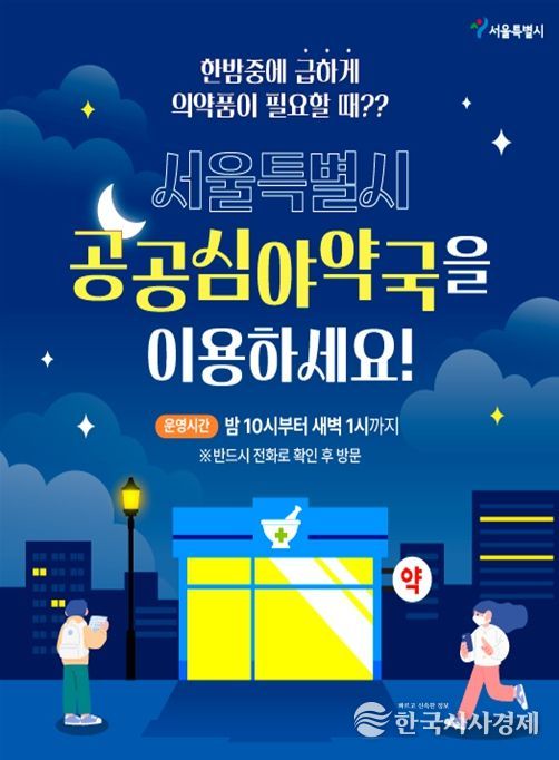 서울시는 늦은 밤 갑작스러운 증상으로 어려움을 겪는 시민을 위해 밤 10시부터 다음 날 새벽 1시까지 운영하는 공공심야약국을 25개 자치구, 총 39개소를 운영하고 있다. 이 중 365일 운영되는 약국은 28곳, 요일별로 운영되는 약국은 11곳이다. 요일별 운영은 월‧수‧금 등 특정 요일을 지정해서 운영하는 방식이다.
