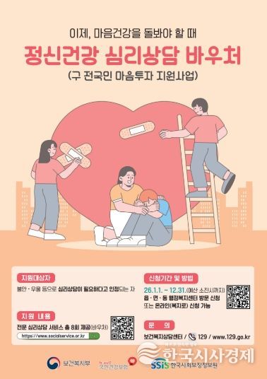 정신건강 심리상담 바우처 사업은 우울·불안, 스트레스 등 심리적 어려움을 겪는 시민에게 전문가와의 1:1 대면 심리상담 서비스를 바우처 형태로 지원하는 제도다. 치료 이전 단계에서 마음 상태를 점검하고, 증상이 악화되기 전 전문적인 개입을 통해 정신질환을 예방하는 데 목적이 있다. 대상자로 선정되면 120일 동안 총 8회의 심리상담 서비스를 이용할 수 있다.