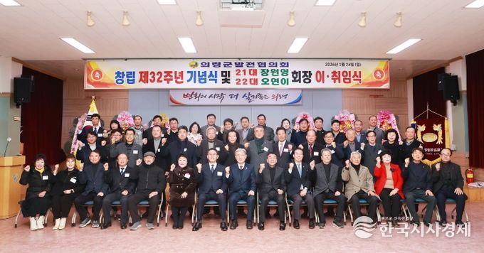 한국시사경제 윤광희 기자 | 의령군발전협의회는 지난 26일 의령읍사무소 3층 회의실에서 회원과 각급 기관·사회단체장이 참석한 가운데 창립 제32주년 기념식과 제21대 장원영 회장, 제22대 오연이 회장의 이·취임식을 개최했다.