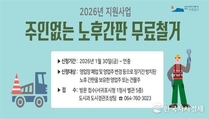 한국시사경제 노승선 기자 | 서귀포시는 안전하고 쾌적한 도시경관 조성 및 소상공인의 경영 안정을 도모하기 위해 30일부터 ‘2026년 주인없는 노후간판 무료철거 지원사업’ 대상자를 연중 모집한다.