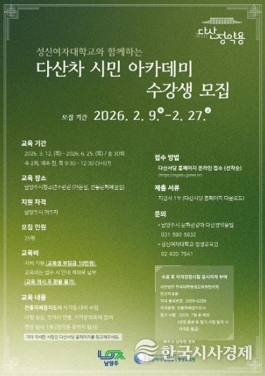 모집 인원은 총 25명으로, 남양주시 평생학습포털 ‘다산서당’을 통해 선착순으로 접수받는다. 교육비는 총 60만 원 상당이나 시의 교육 지원을 통해 10만 원의 자부담만으로 참여할 수 있다. 남양주시 거주 고등학교 졸업자 이상 시민이면 누구나 신청 가능하다.