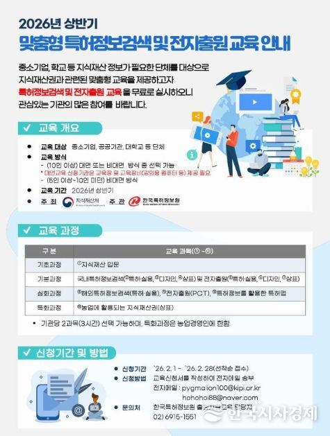 한국시사경제 디지털 뉴스팀 | 지식재산처는 예비 출원인들의 지식재산 출원 역량 강화를 위해 2월 1일부터 ❶맞춤형 특허정보검색 및 전자출원 교육과 ❷지식재산권 초청 교육에 참여할 신청자를 모집한다고 밝혔다.