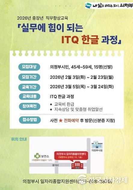 한국시사경제 경기북부취재본부 | 의정부시는 2026년 중장년 직무향상교육의 일환으로 ‘실무에 힘이 되는 ITQ 한글 과정’ 참여자를 모집한다.