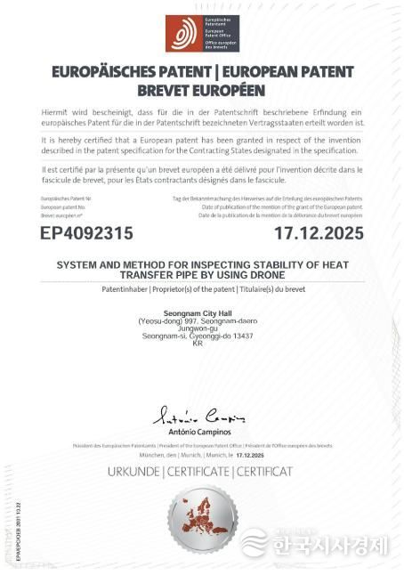 한국시사경제 경기취재본부 | 성남시가 자체 개발한 ‘드론을 이용한 열수송관 안정성 검사 시스템’이 유럽특허(등록번호 EP4092315) 등록을 완료했다고 밝혔다. 이는 시 최초의 해외특허 등록 사례로, 지식재산의 해외 권리화를 통해 유럽 수출길을 여는 계기가 될 것으로 기대된다.