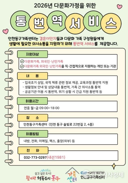 한국시사경제 문화팀 | 인천동구가족센터는 결혼이민자의 언어 장벽을 해소하고 안정적인 한국 사회 정착을 돕기 위해 ‘결혼이민자 통·번역 무료서비스’를 운영한다고 밝혔다.