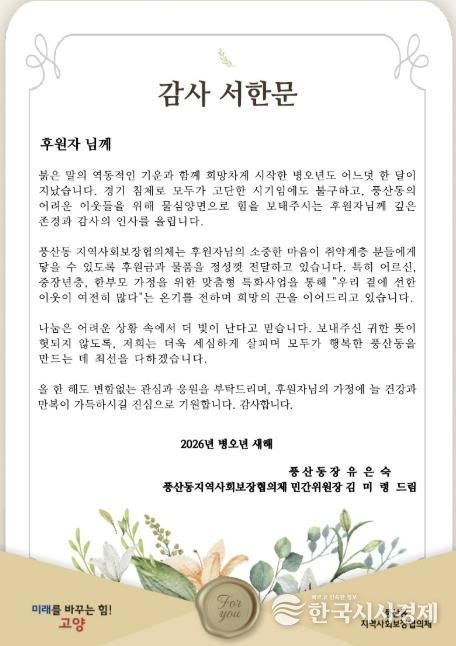 한국시사경제 권충현 기자 | 고양특례시 일산동구 풍산동 지역사회보장협의체는 설명절을 앞둔 지난 3일 지난해 지역사회의 어려운 이웃을 위해 따뜻한 나눔을 실천한 후원자들에게 감사의 마음을 담은 서한문을 발송했다.