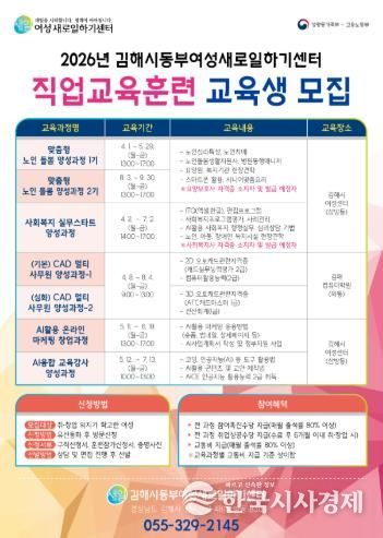 한국시사경제 노승선 기자 | (재)김해시복지재단 동부여성새로일하기센터는 여성들의 취·창업 역량을 강화하고 지역사회의 특성과 시대적 흐름에 맞춘 여성 특화 직업교육훈련 과정의 교육생을 지난 2일부터 모집한다고 밝혔다.