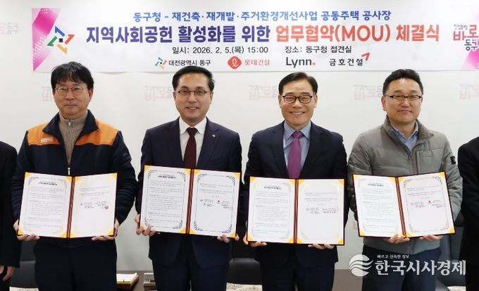 한국시사경제 대전취재본부 | 대전 동구는 5일 관내 대규모 공동주택 공사 현장의 시공사와 ‘지역사회 공헌 활성화 업무협약’을 체결하고, 지역 안전관리 강화와 상생 협력을 위한 협력 체계를 구축했다고 밝혔다.