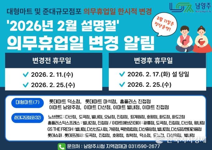 한국시사경제 경기북부취재본부 | 남양주시는 설 명절을 맞아 관내 대형마트와 일부 준대규모점포(SSM)의 의무휴업일을 기존 2월 11일(수)에서 설 당일인 17일(화)로 한시적 변경 운영한다고 5일 밝혔다.