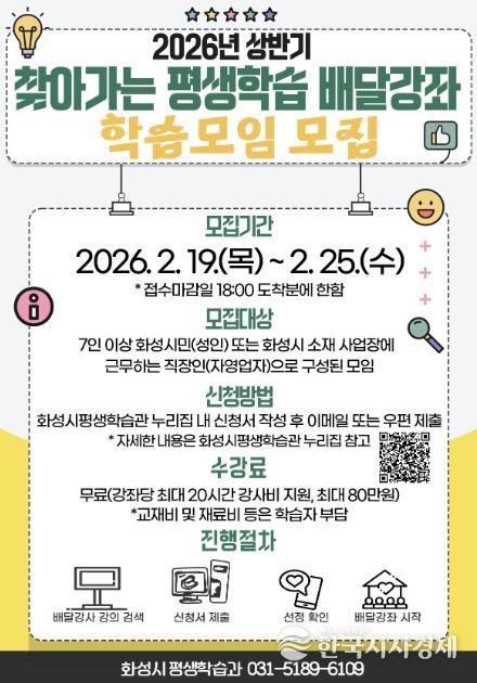 한국시사경제 사회팀 | 화성특례시는 2월 19일부터 2월 25일까지 2026년 상반기'찾아가는 평생학습 배달강좌'학습모임을 모집한다.
