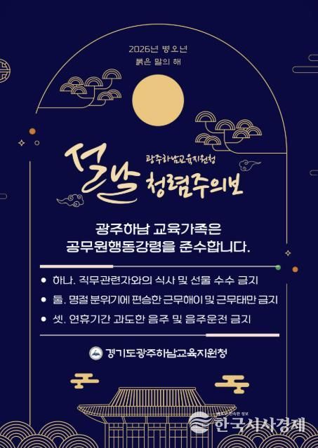 한국시사경제 기동취재팀 | 경기도광주하남교육지원청은 2월 9일, 2026년 병오년 설명절을 맞아 관내 교직원들이 청렴한 마음가짐으로 새해를 시작할 수 있도록‘교육장 청렴서한문’과‘청렴주의보’를 각급 학교에 전달했다.