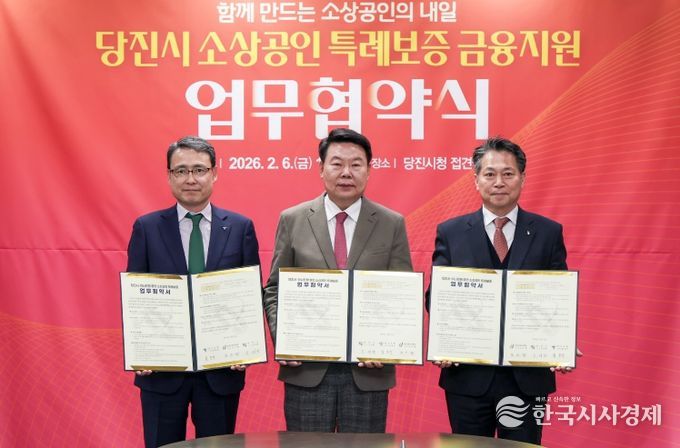 한국시사경제 충남취재본부 | 당진시는 6일 당진시청 접견실에서 오성환 당진시장과 함종덕 하나은행 충남북영업본부 지역대표, 조소행 충남신용보증재단 이사장이 참석한 가운데 소상공인 특례보증 금융지원을 위한 업무협약을 체결했다고 밝혔다.
