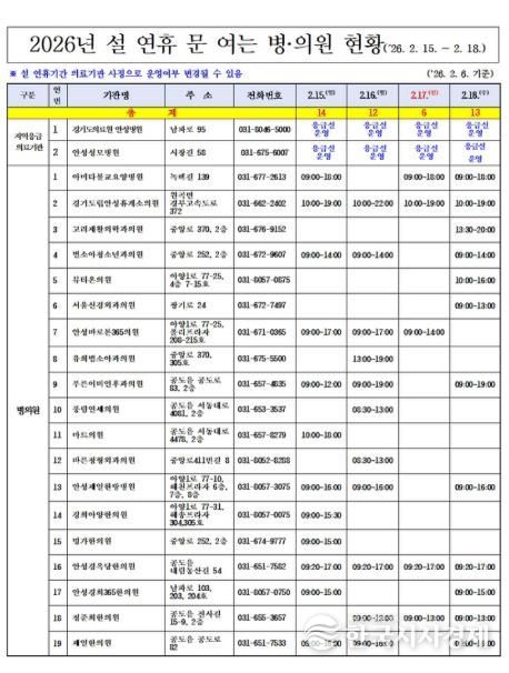 한국시사경제 경기취재본부 | 안성시는 설 연휴 기간(14일~18일, 5일간) 동안 의료 공백을 최소화하고 응급 상황에 신속히 대응하기 위해 ‘응급진료 상황실’을 운영한다고 밝혔다.