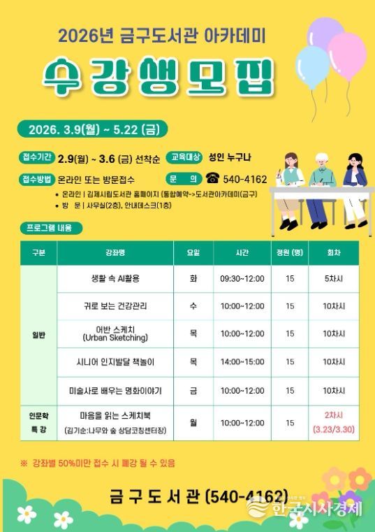 한국시사경제 김숙영 기자 | 김제시 금구도서관은 지역 주민들의 자기 계발과 문화 향유 기회를 확대하기 위해 2026년 금구도서관 아카데미 수강생을 오는 3월 6일까지 선착순 모집한다고 밝혔다.
