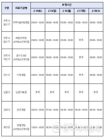 한국시사경제 의료보건팀 | 전북특별자치도는 설 연휴 기간인 14일부터 18일까지 5일간 도민들의 의료기관·약국 이용 불편을 최소화하고, 응급환자 진료 및 대량 환자 발생에 대비해 응급진료체계를 가동한다고 10일 밝혔다.