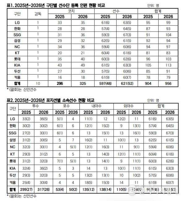 한국시사경제 스포츠팀 | KBO는 2월 10일(화) 2026년 KBO 리그 소속 선수 명단을 공시했다. 10개 구단은 총 621명의 선수를 등록해, 597명이 등록했던 2025년보다 24명이 늘어났다.