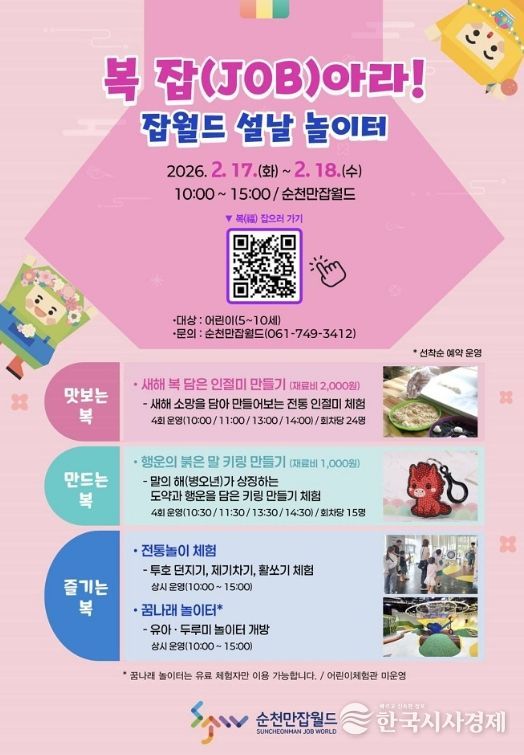 한국시사경제 전남취재본부 | 순천시는 오는 17일부터 18일까지 설날 연휴를 맞아 순천만잡월드에서 ‘복 잡(JOB)아라! 잡월드 설날 놀이터’ 이벤트를 개최한다고 밝혔다.