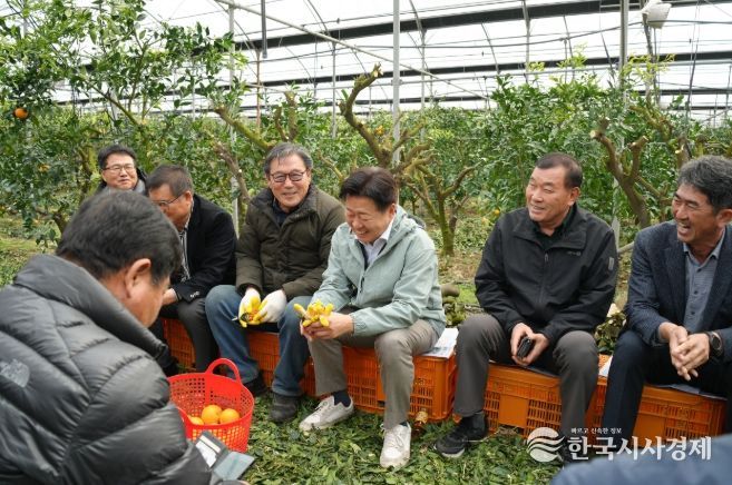 오영훈 지사는 11일 제주시 아라동 소재 한라봉 재배 농가를 방문해 수확 현장을 둘러보고 만감류 재배 농가들과 간담회를 열어 현장 애로사항에 귀 기울였다.