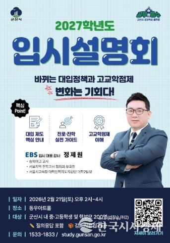 한국시사경제 전북취재본부 | 군산시가 변화하는 대입 정책과 고교학점제에 대한 학생·학부모의 이해를 돕기 위해 21일 오후 2시 동우아트홀에서 ‘2027학년도 입시설명회’를 개최한다.