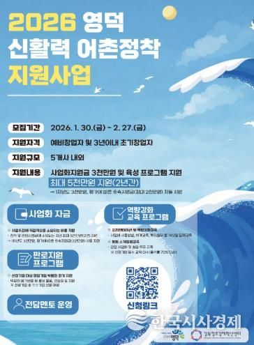 한국시사경제 이정이 기자 | 영덕군은 지역자원을 활용한 창업자를 발굴하고 육성하기 위해 ‘신활력 어촌정착 지원사업’에 참여할 창업자를 이달 27일까지 온라인으로 모집한다.