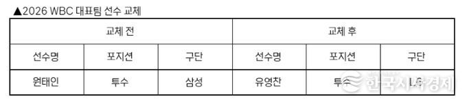 한국시사경제 스포츠팀 | KBO 전력강화위원회는 부상으로 인해 WBC 참가가 어려워진 삼성 원태인을 대체할 선수로 LG 유영찬을 확정하고 WBC 조직위에 선수 교체 승인을 요청했다.