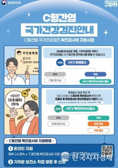 질병관리청은 2026년부터 56세(1970년생)를 대상으로 국가건강검진에서 C형간염 항체 양성 판정을 받은 경우, 확진 검사비 지원 의료기관을 기존 병·의원급에서 상급·종합병원까지 포함한 모든 의료기관으로 확대한다. 지원 항목은 진찰료와 검사비 본인부담금이다. 1회 최대 7만 원을 지원한다.