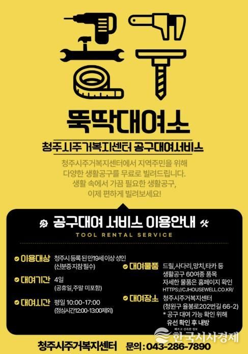 한국시사경제 오영주 기자 | 청주시는 청주시주거복지센터(청원구 율량동)에 마련한 공구대여소인 ‘뚝딱대여소’를 본격 운영해 생활밀착형 주거복지 행정을 펼친다고 20일 밝혔다.