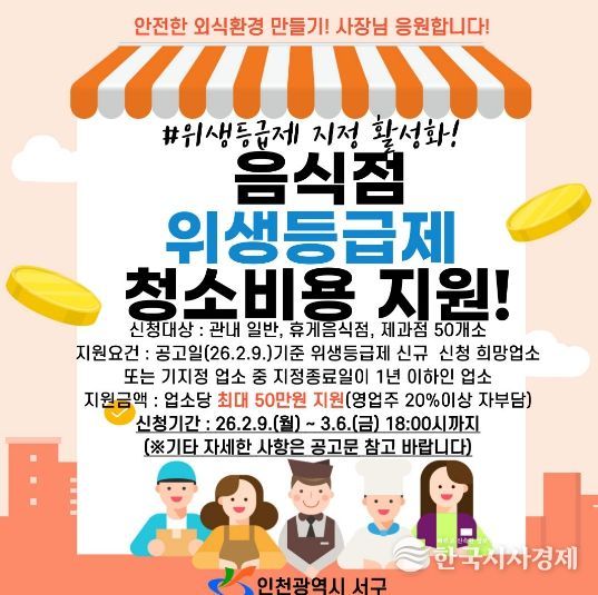 한국시사경제 의료보건팀 | 인천 서구는 관내 음식점의 위생 수준을 높이고 안전한 먹거리 환경을 조성하기 위해 ‘음식점 위생등급제 청소비 지원사업’ 참여 업소를 모집한다고 20일 밝혔다.