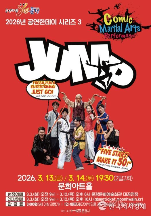 한국시사경제 이정이 기자 | 문경문화예술회관에서는 화려한 공중회전을 선보이는 아크로바틱과 고난이도 동양 무예, 슬랩스틱 코미디가 어우러진 넌버벌 퍼포먼스 점프(JUMP) 공연을 3월 13일 19:30, 14일 19:30 (2일 2회)에 문희아트홀에서 개최한다.