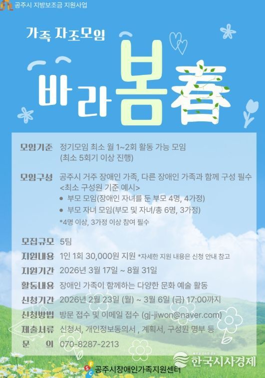한국시사경제 문화팀 | 공주시 장애인가족지원센터는 2026년 장애인 가족을 위한 자조모임 프로그램 ‘바라봄(春)’을 운영하고 참여자를 모집한다고 밝혔다.