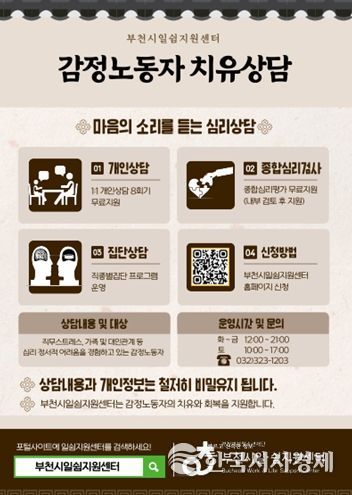 한국시사경제 경기취재본부 | 부천시여성청소년재단이 운영하는 부천시일쉼지원센터 치유상담실은 감정노동자에게 전문가 개인상담과 종합심리검사 등을 지원한다.
