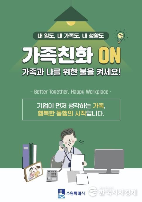 이를 위해 수원시는 일과 가정이 조화를 이루는 가족 친화적인 직장 분위기를 확산하고자 ‘일가(家)양득’ 사업을 시작한다. 300인 미만 중소사업장에서 조기퇴근이나 특별휴가 등 가족친화의 날을 운영하고, 돌봄·건강·여가·교육 분야 가족친화 분위기 조성 프로그램을 운영하면 장려금을 지급할 계획이다. 일과 가정이 양립할 수 있는 기업문화 확산을 위해 가족친화 인증기업 우수사례 발굴, 찾아가는 직장교육, 출생 친화 분위기 조성 유공자 포상 등을 진행할 예정이다.