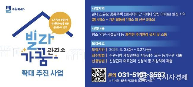 한국시사경제 사회팀 | 수원특례시는 노후 빌라 밀집지역을 체계적으로 관리하고, 주거환경을 개선하는 ‘2026년 빌라가꿈관리소 확대 추진사업’의 대상지 신청을 3월 27일까지 받는다.