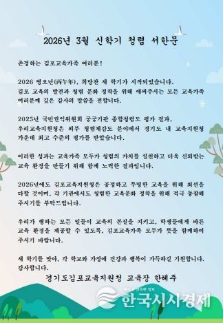 한국시사경제 문화팀 | 김포교육지원청은 2026년 3월 신학기를 맞아 관내 학교를 대상으로 ‘교육장 청렴 서한문’을 발송했다고 밝혔다.