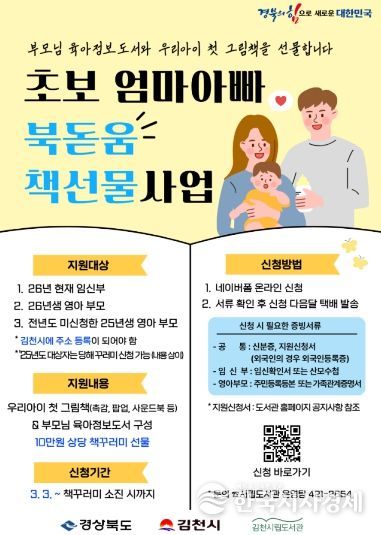한국시사경제 권충언 기자 | 김천시립도서관(관장 이신기)은 예비 부모와 영아 가정을 응원하고, 생애 초기부터 책과 함께하는 양육 환경을 조성하기 위해 '초보 엄마아빠 북돋움 책선물 사업'을 추진한다.