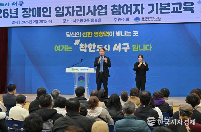 한국시사경제 문화팀 | 광주광역시 서구가 장애인의 사회참여 확대와 자립기반 강화를 위한 ‘2026년 장애인일자리사업’을 추진한다. 서구는 25일 서구청 들불홀에서 장애인일자리사업 참여자 160여 명을 대상으로 안전보건 및 직무 소양 교육을 실시했다. 이번 교육은 참여자들의 직무 이해도를 높이고 산업재해를 예방하기 위해 마련됐다.